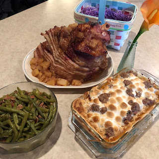 Today, after some yard work, I was able to prepare a delicious meal which culminated in an unexpected Easter egg hunt for Tom. I made a Baked Ham with Pineapple Brown Sugar Glaze, Sweet Potato Casserole with Marshmallow & Pecan Streusel and Southern Style Green Beans. I enjoyed everything that I prepared, and Tom did, too! The ham wasn't too sweet, the sweet potato casserole had a good flavor, due to the addition of cinnamon and cloves, and the green beans were tender and delicious. I recommend giving those recipes a try.